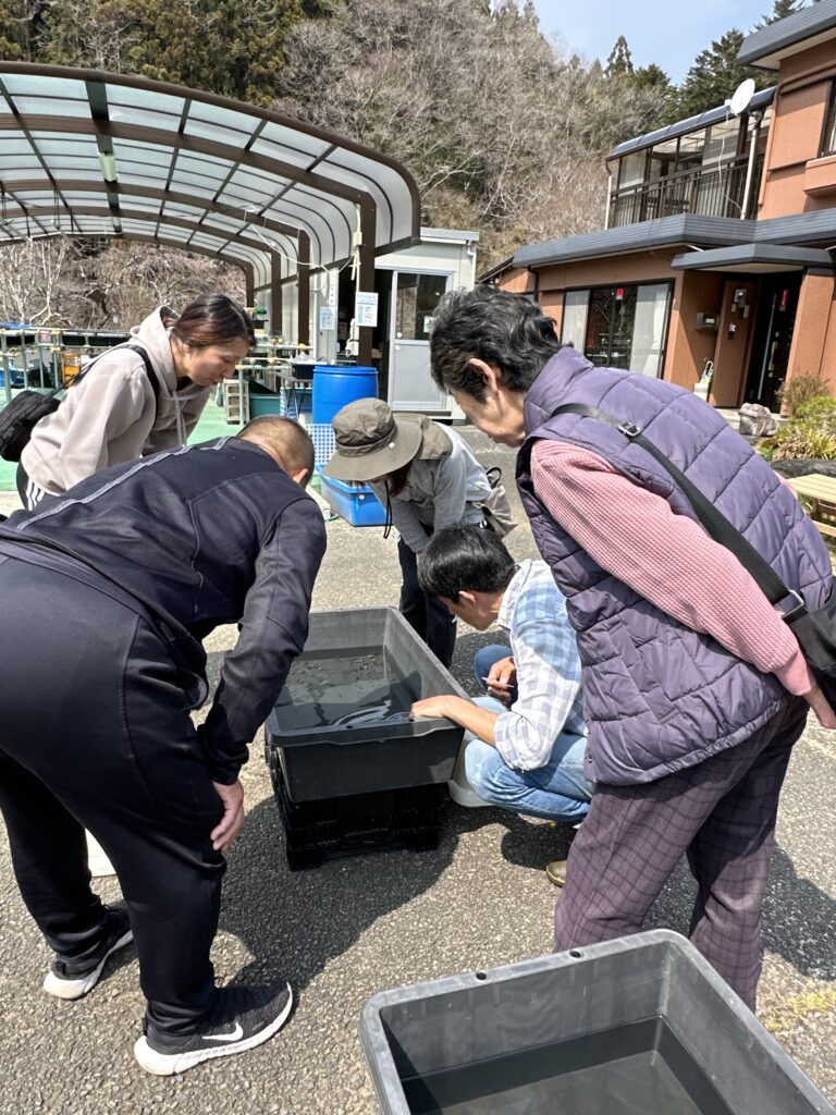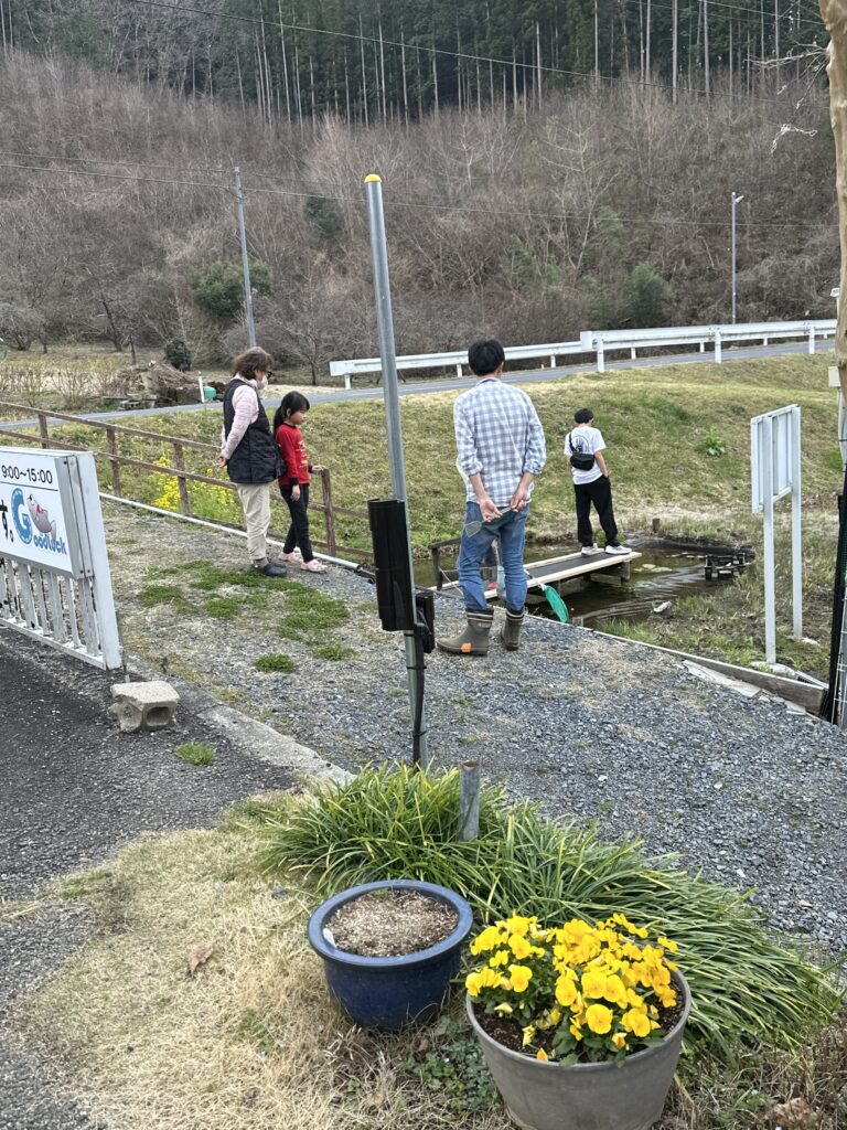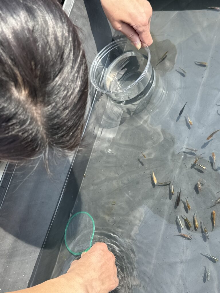 初めて体験のお客様にポイでのすくい方を伝授🐟