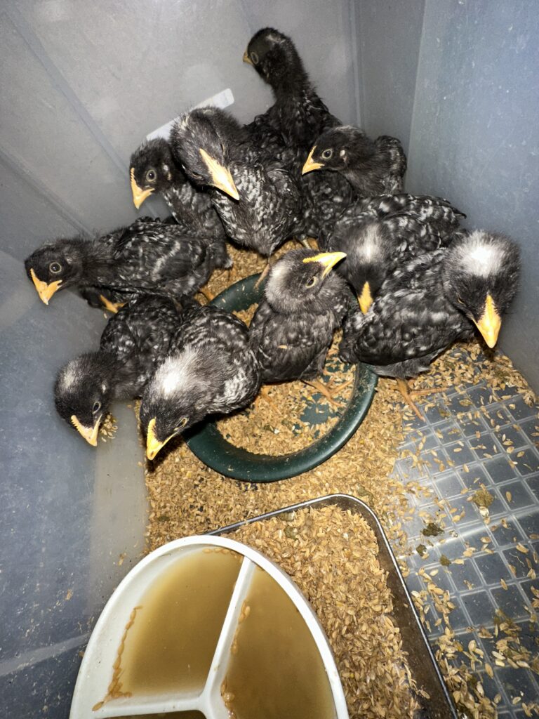 次は、ヒナから育てた岡崎おうはんのひよこの成長が待っています。11月20日生まれがもうこんなに大きくなたので2容器に分けて育てています。