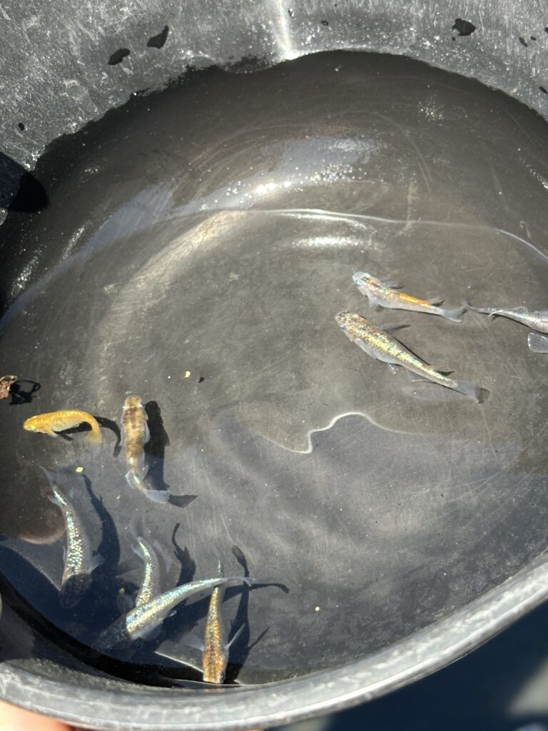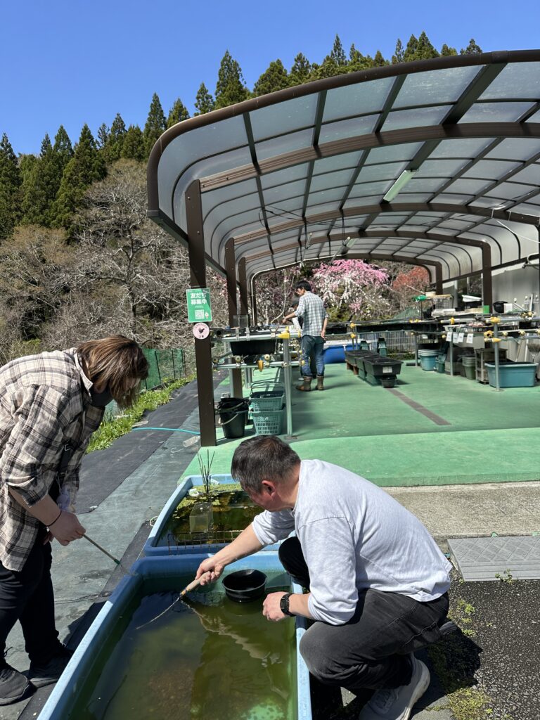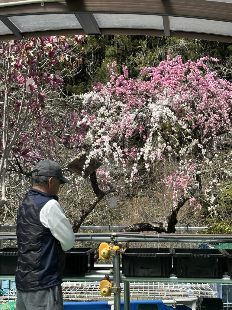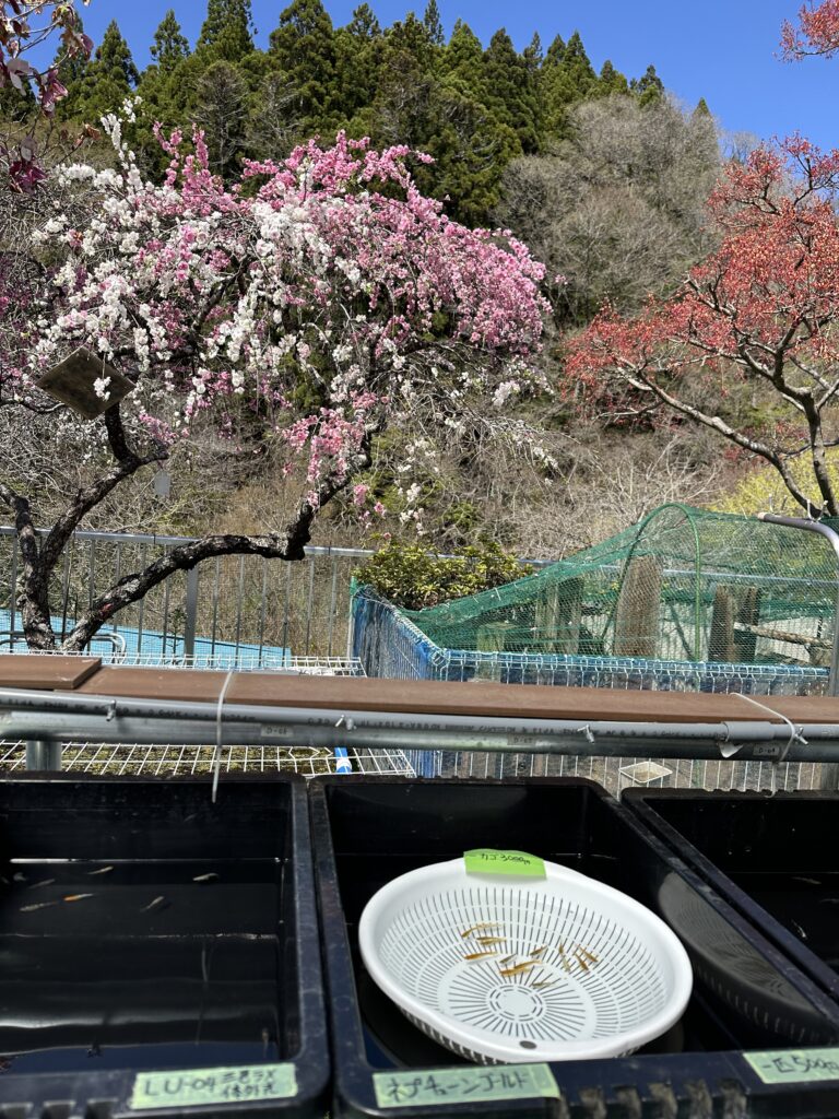 販売コーナーのめだか達を花桃が見つめています。いらっしゃいませ❣