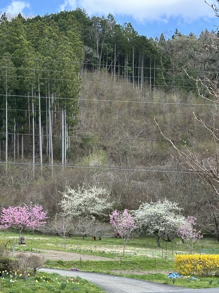 お隣さんの畑の様子。春色満載です🌸ミツバチの巣箱を置かせて頂いています。