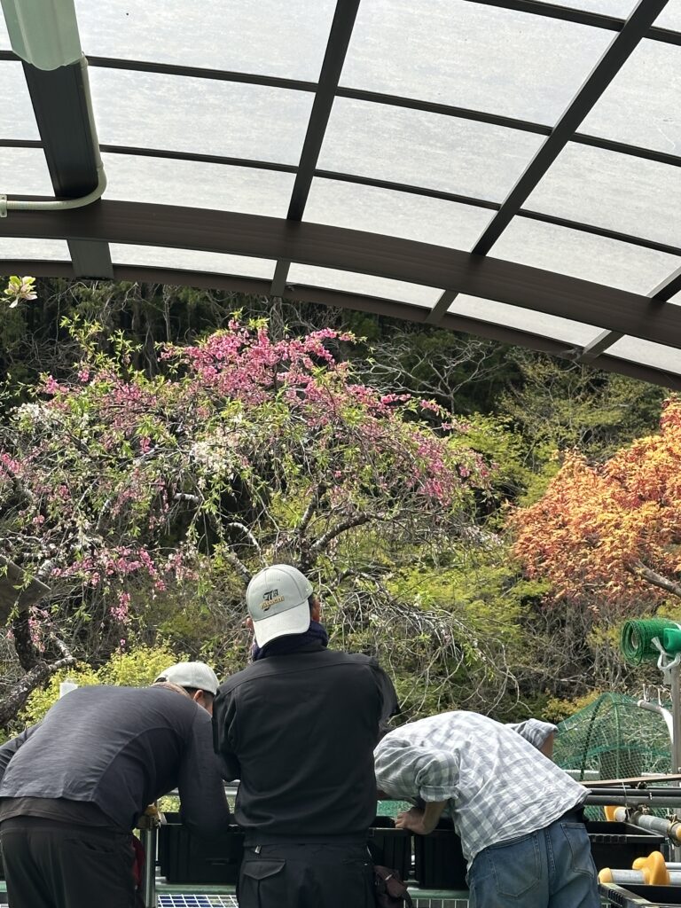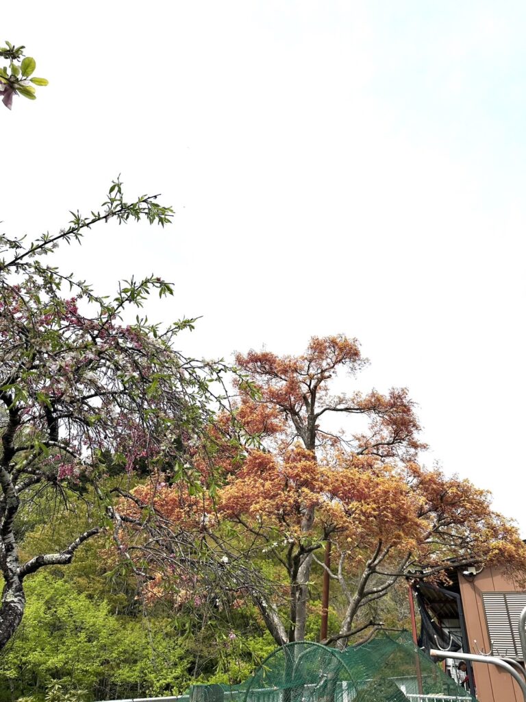ハナモモが終わり、隣のモミジの木の葉が春色付き花咲きのよう。