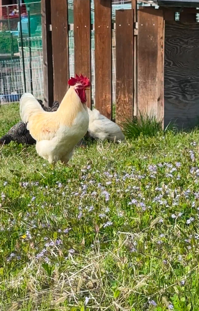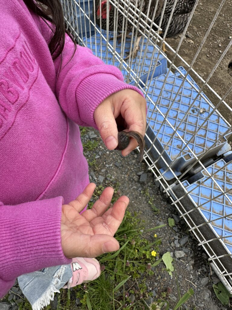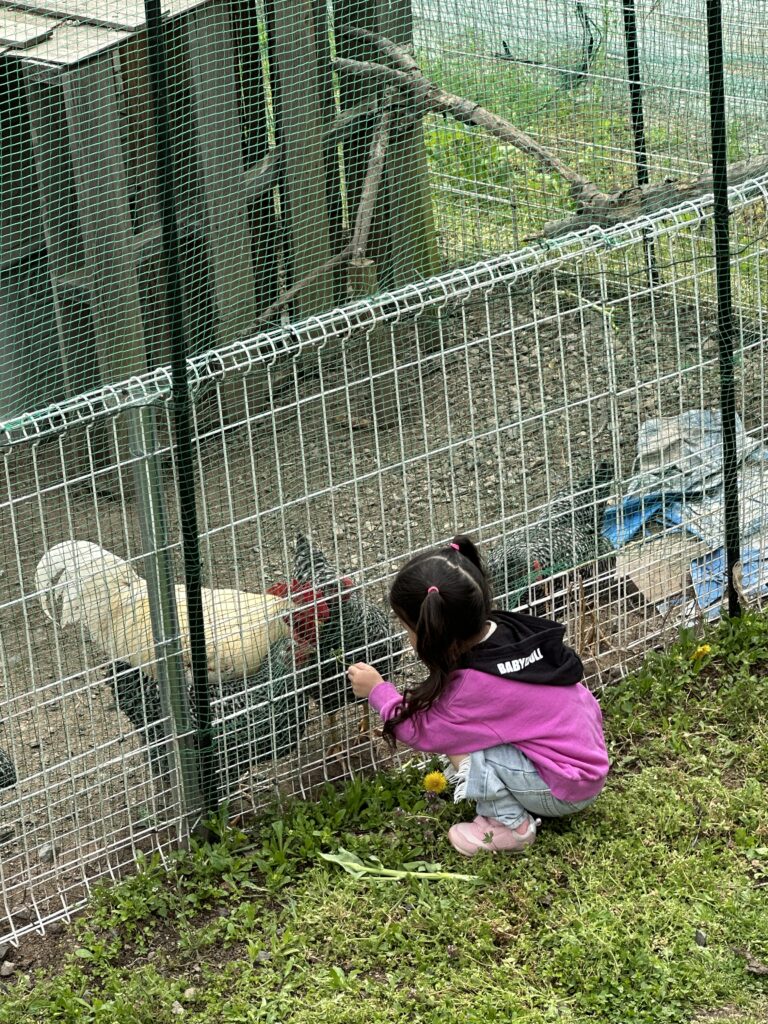 🐓🐔🐓にわとりたちに🍃エサも上手にあげています。