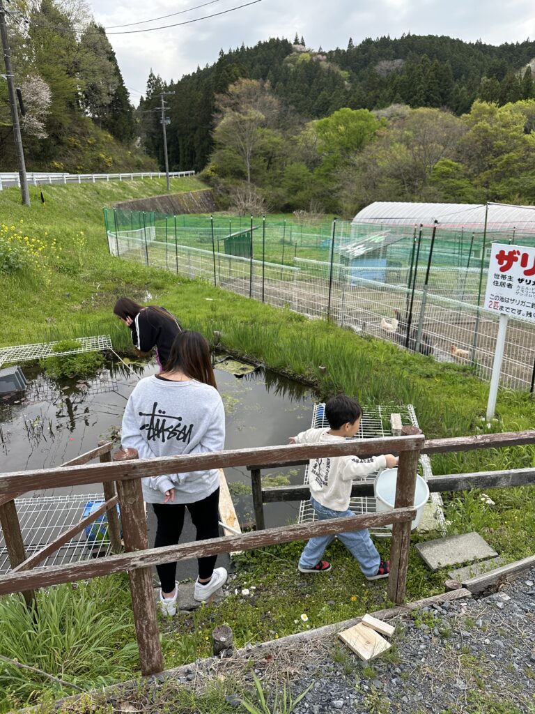 子どもたちは、ザリガニがなかなかつれずオタマジャクシを網ですくって遊びます。