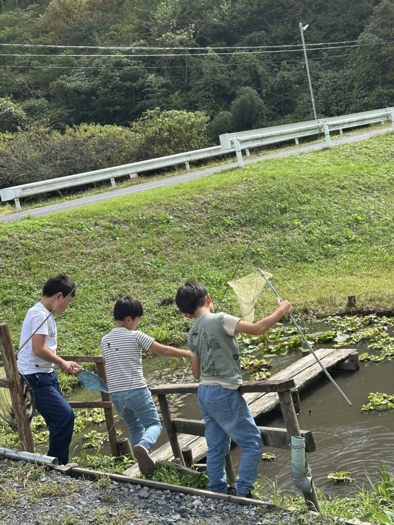ザリガニ釣りや生き物探しに夢中な三兄弟。