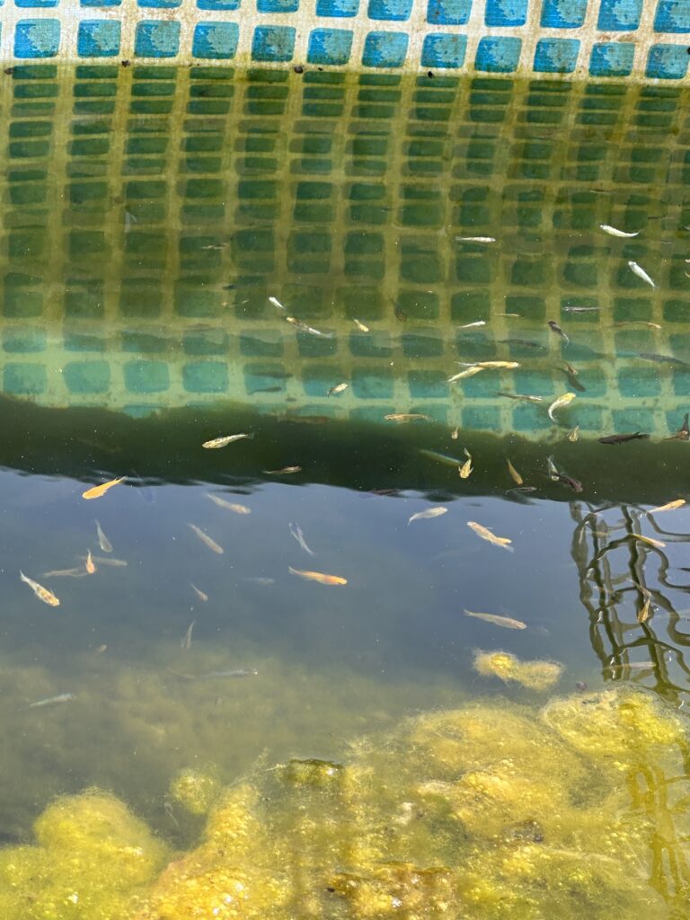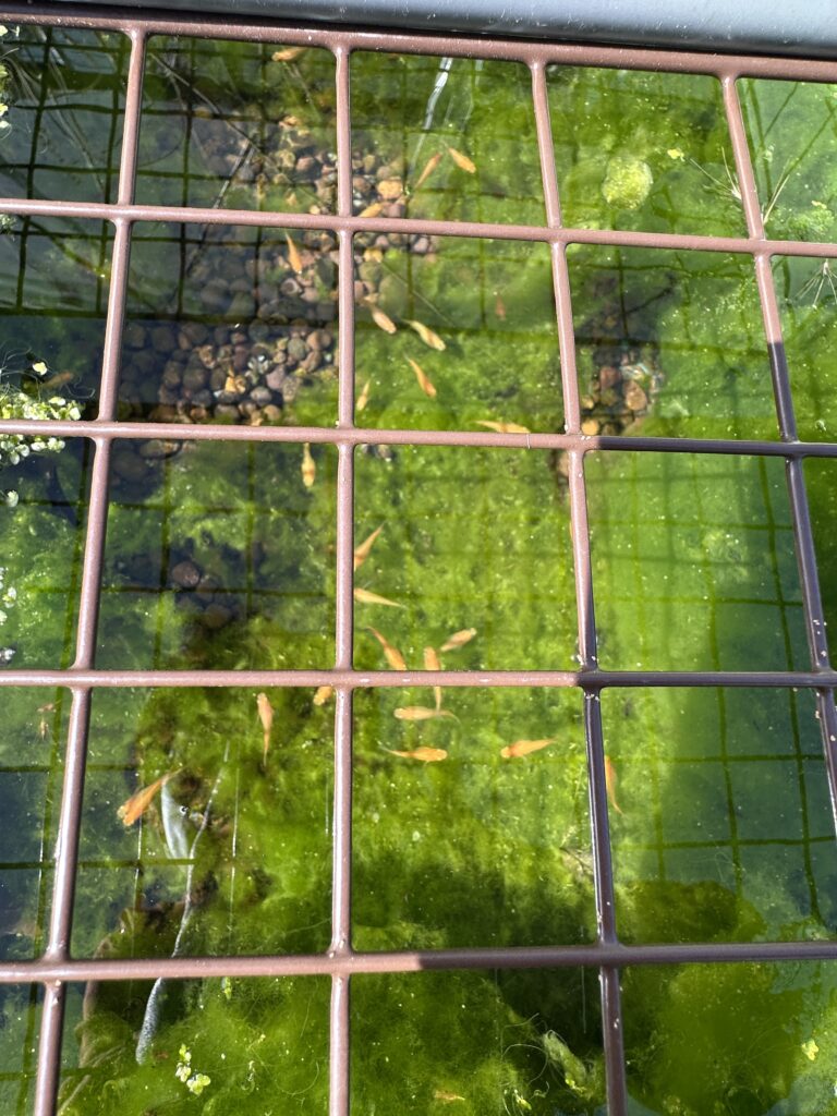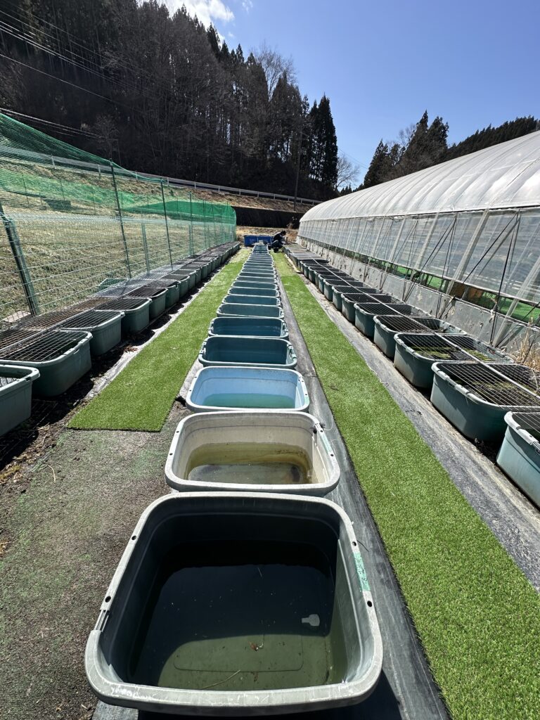 飼育場の様子を覗いてみました。中央の桶は稚魚の居場所になるそうです。